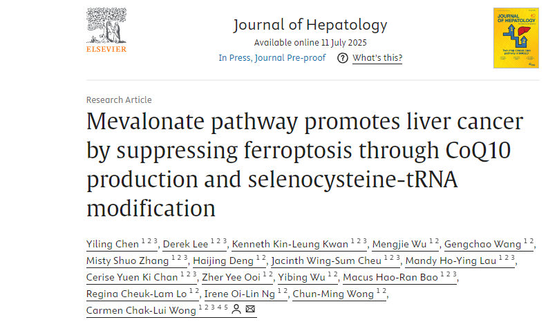 2025年7月11日,香港大学黄泽蕾团队在 Journal of Hepatology (IF=33)发表了题为“Mevalonate pathway promotes liver cancer by suppressing ferroptosis through CoQ10 production and selenocysteine-tRNA modification”的研究论文。