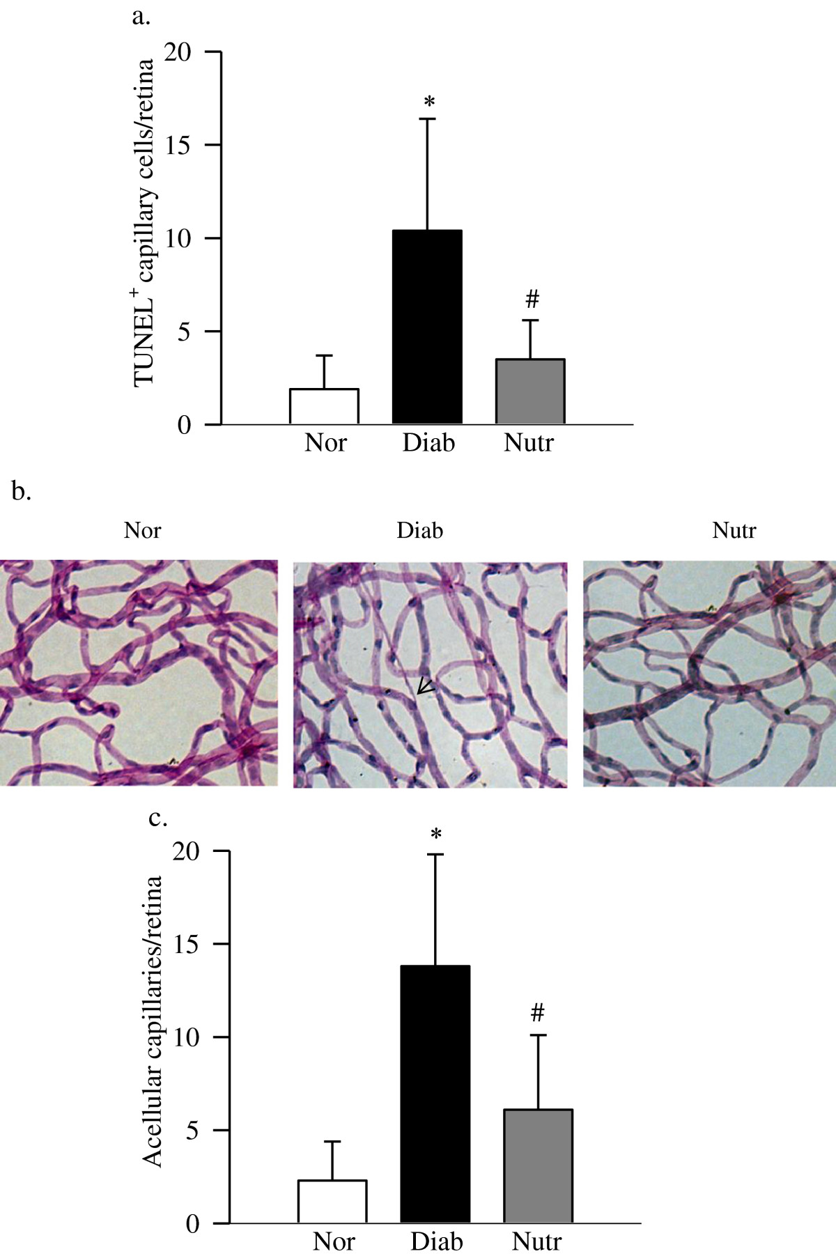 结果:含有类胡萝卜素的膳食补充剂可防止糖尿病视网膜病变加速毛细血管细胞凋亡和组织病理学:正如预期的那样,在 11 个月大的糖尿病大鼠中,3 个视网膜血管中有 4 个 TUNEL 阳性细胞。退化的毛细血管。含类胡萝卜素的膳食补充剂可改善糖尿病引起的毛细血管细胞凋亡,正常膳食大鼠TUNEL阳性毛细血管细胞数量与糖尿病大鼠相同。在用膳食补充剂治疗的糖尿病大鼠中,与没有膳食补充剂的大鼠相比,视网膜血管中退行性毛细血管的数量显着减少。通过 ERG 测量评估视网膜功能。图 2 显示,在视网膜电图反应延迟的糖尿病大鼠中,A 波和 B 波的振幅显着降低。 A 波和 B 波振幅的减少是由于接受了补充营养的饮食。