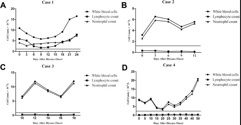 4例患者在时间上的白细胞、中性粒细胞、淋巴细胞计数
