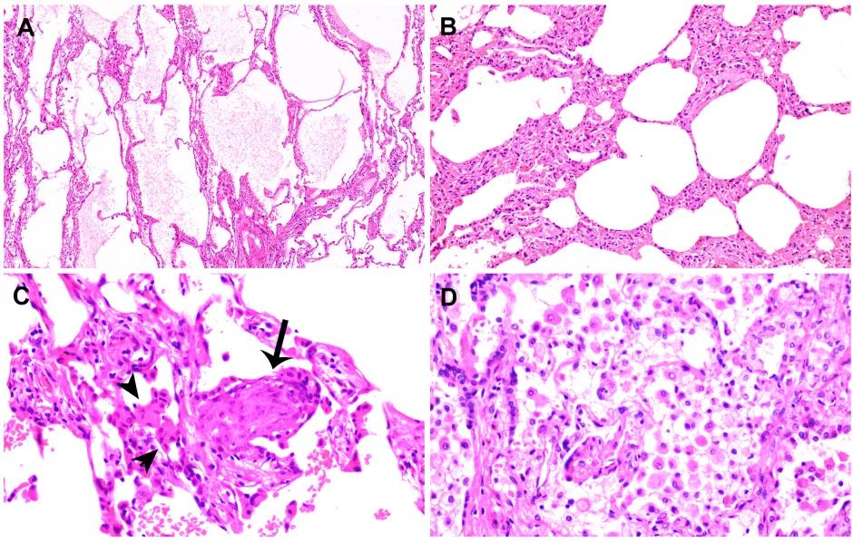 (D)增生性肺细胞,部分有可疑的病毒包涵体(箭头。