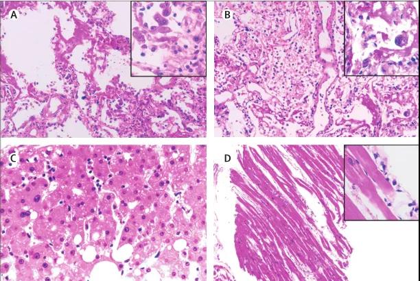 实验对4例年龄介于59~81岁的COVID-19肺炎患者进行了死后肺、肝和心脏穿刺活检。每个患者至少有一种潜在疾病,包括免疫缺陷状态(慢性淋巴细胞白血病和肾移植)或其他情况(肝硬化、高血压和糖尿病),从发病到死亡的时间从15天到52天不等。经检查发现所有患者的白细胞计数均升高,并在接近结束时显著升高,除白血病患者外,所有患者均出现淋巴细胞减少组织病理学观察主要表现在肺,包括肺泡上皮细胞损伤、透明膜形成、II型肺细胞增生,均为弥漫性肺泡损伤的组成部分。纤维母细胞增生、细胞外基质和纤维蛋白在空气中的聚集是很明显的。