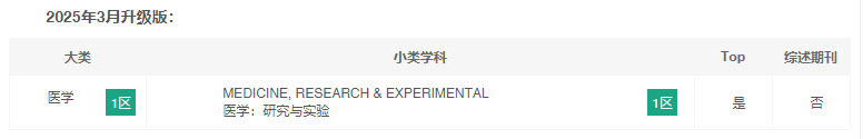 JCR分区Q1,在医学研究与实验分区排名为5/189 (97.6%)。值得注意的是,今年首次获得中科院分区,显示为医学大类1区TOP期刊。