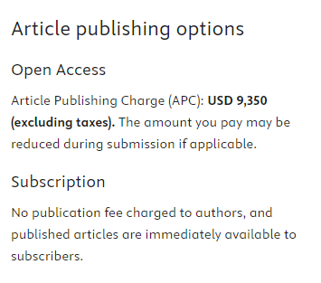 作为一本混合期刊,传统模式无需支付版面费,以OA发表的版面费为9350美元,约合人民币6.73万元。对于一本接近13分的期刊而言,这个版面费略贵,鉴于其领域内排名第五,又不算太贵,经费足的大佬们可以冲!