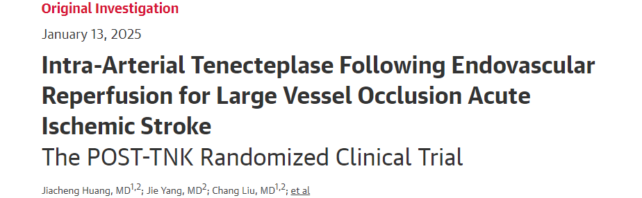 同日,陆军军医大学第二附属医院资文杰教授团队也在《JAMA》发文,题为“Intra-Arterial Tenecteplase Following Endovascular Reperfusion for Large Vessel Occlusion Acute Ischemic Stroke:The POST-TNK Randomized Clinical Trial”的研究论文。