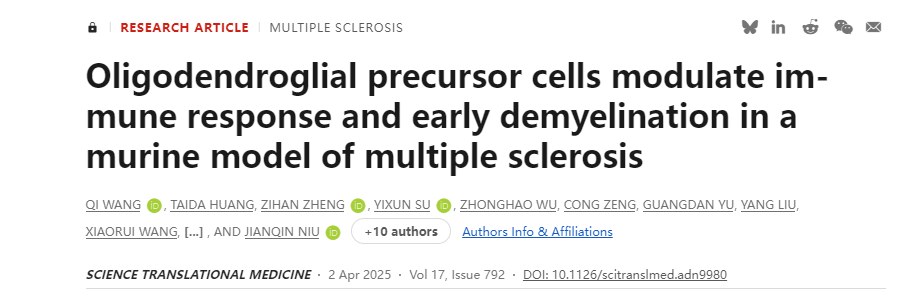4月2日,陆军军医大学牛建钦、万瑛、中山大学易陈菊共同通讯在Science Translational Medicine 在线发表题为“Oligodendroglial precursor cells modulate immune response and early demyelination in a murine model of multiple sclerosis”的研究论文。
