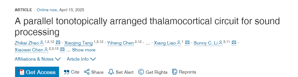 2025年4月15日,陆军军医大学谌小维、重庆脑与智能科学中心Sunny C. Li、重庆大学廖祥、Zhao Zhikai共同通讯在 Neuron 发表了题为“A parallel tonotopically arranged thalamocortical circuit for sound processing”的研究论文。