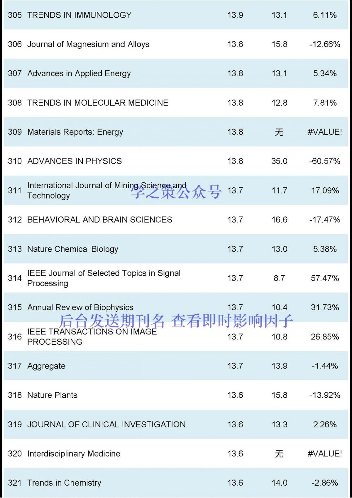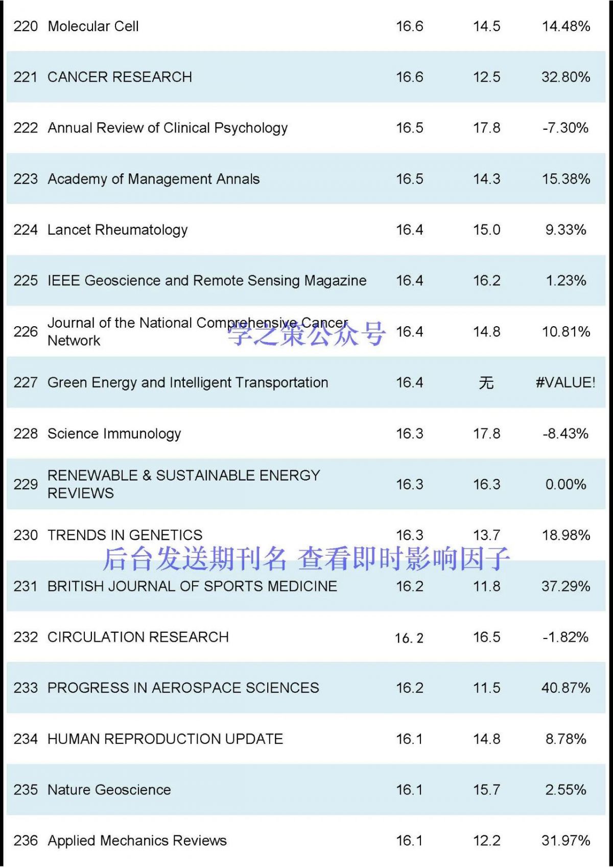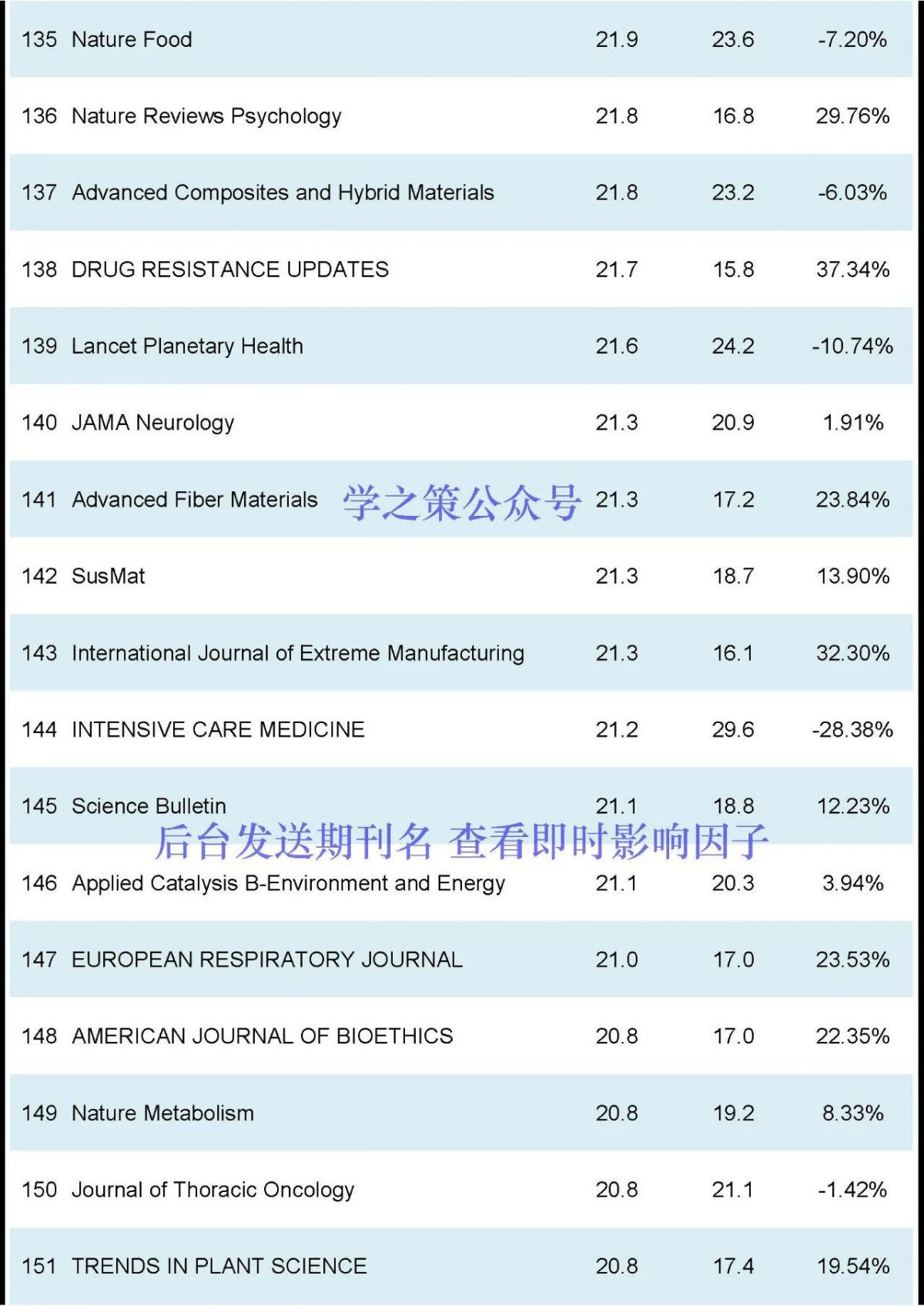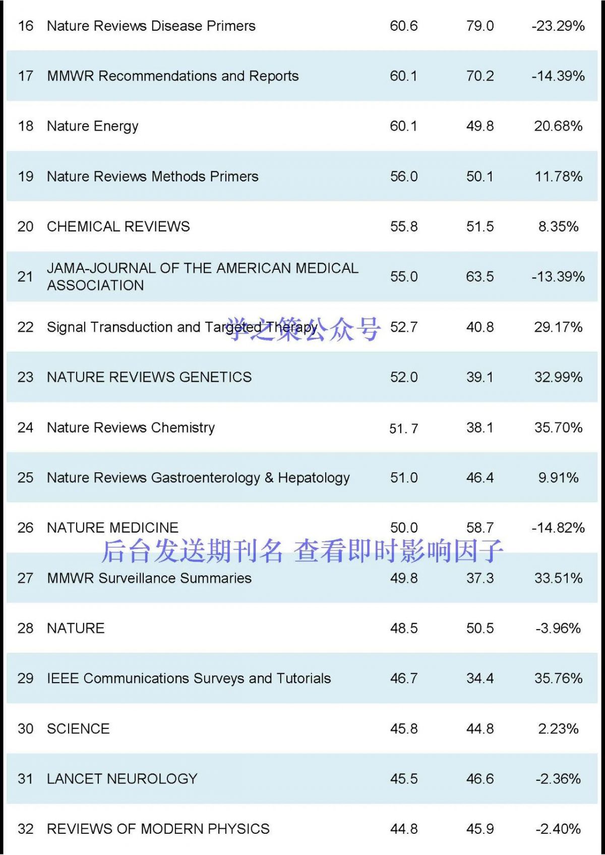 CA-A CANCER JOURNAL FOR CLINICIANS的IF腰斩,但凭借232.4的高分仍然高居榜首。其次是两本Nature综述子刊。