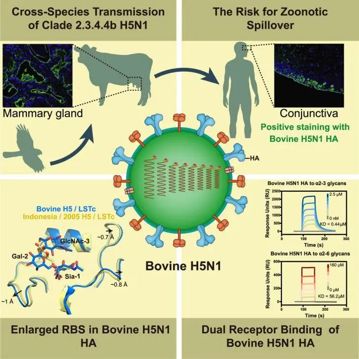 该研究对牛传播H5N1禽流感病毒血凝素(HA)蛋白的受体结合特性、组织嗜性及其结构变化开展了深入研究,结果阐明了HA蛋白受体偏好性的分子基础,并提示了病毒的潜在流行风险和对这一新发病原体持续监测的迫切需求。