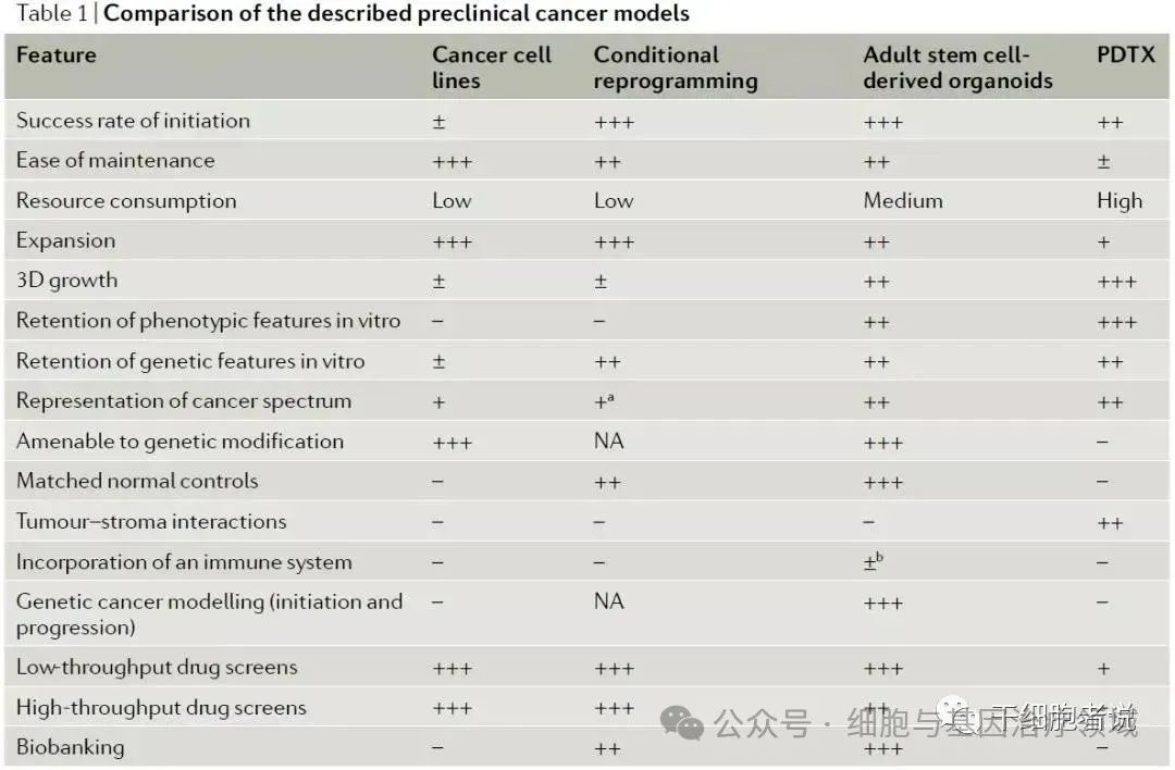 目前,类器官多用于肿瘤癌症的研究中。观察下图中临床前肿瘤癌症模型的比较,可以发现类器官有着很强的优势: