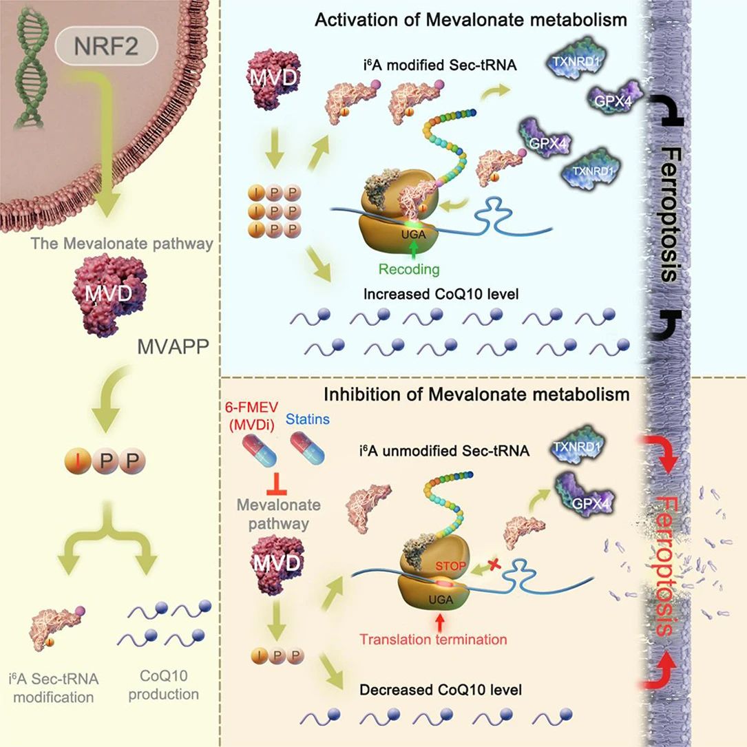 通过细胞实验和动物模型发现,敲低或敲除 MVD 后,IPP 水平下降直接导致 CoQ10 合成减少,同时 i6A37修饰受阻使 Sec-tRNA不稳定,导致 GPX4、TXNRD1 等硒蛋白翻译受抑制。