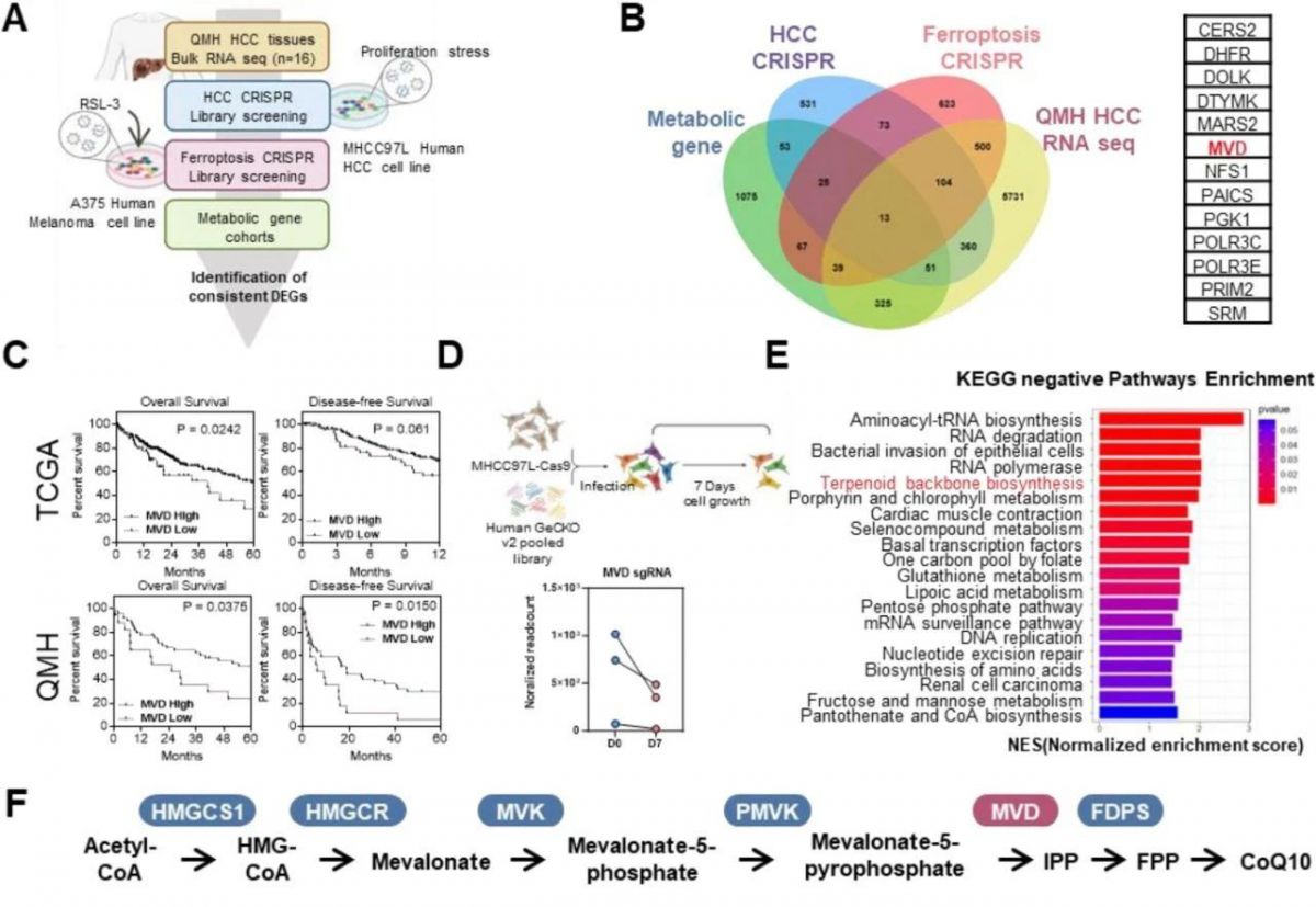 研究团队发现,甲羟戊酸通路在肝癌中异常激活(如 MVD 高表达),而该通路通过影响 CoQ10 合成和硒蛋白(如 GPX4)翻译,直接参与肝癌细胞对铁死亡的抵抗。