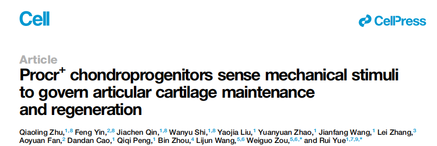 2025年7月21日,同济大学生命科学与技术学院、附属东方医院再生医学研究所岳锐教授课题组与海南医科大学邹卫国共同通讯在 Cell 发表了题为“Procr⁺ chondroprogenitors sense mechanical stimuli to govern articular cartilage maintenance and regeneration”的研究论文。