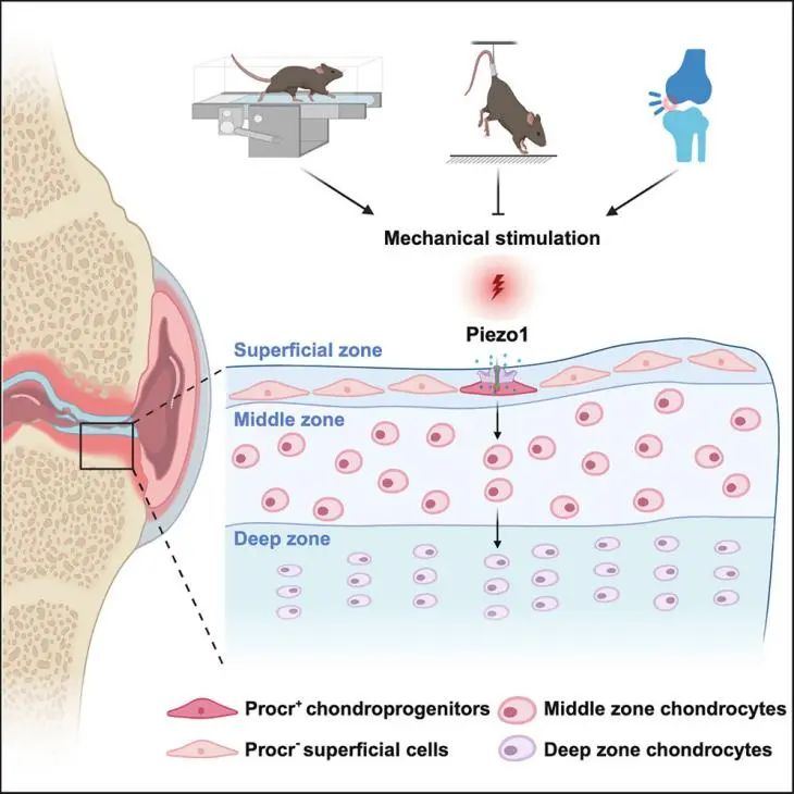 该研究首次发现了对力学刺激敏感的Procr⁺软骨干细胞,并揭示Procr⁺软骨祖细胞感知机械刺激调控关节软骨维持与再生的新机制。