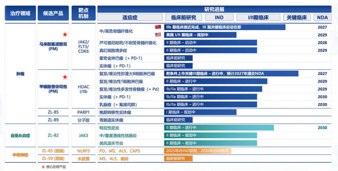 PM 是全球首个单药用于复发 / 难治性淋巴瘤临床试验的高选择性 HDAC 抑制剂。目前,PM 单药已完成 1 期治疗血液瘤以及 2a/2b 期治疗复发 / 难治性弥漫大 B 细胞淋巴瘤(r/r DLBCL)的全国多中心临床试验,同步也在进行 T 淋巴瘤、实体瘤、乳腺癌的 1/2 期临床。在 r/r DLBCL 的 2a 期研究中,其客观缓解率(ORR)达到 69.0%,不劣于甚至优于当时主流双抗、ADC 药物联合治疗约 50%-65% 的效果。目前,该产品已顺利进入关键性 3 期临床研究。