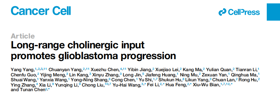 2025 年 8 月 18 日,陆军军医大学西南医院脑胶质瘤医学研究中心陈图南、卞修武、冯华、李飞、安徽医科大学王玉海等人在Cancer Cell (IF=44.5)发表了题为:“Long-range Cholinergic Input Promotes Glioblastoma Progression”的研究论文。