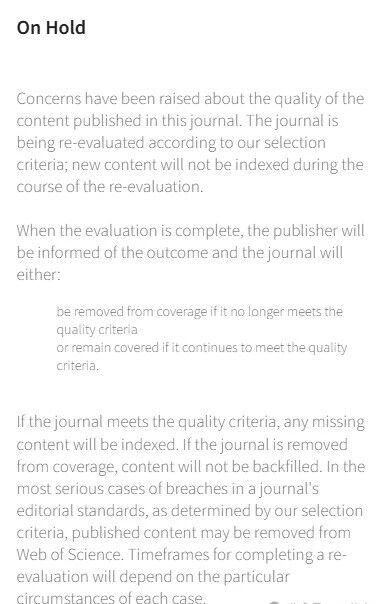 科睿唯安是个动态数据库,除了每月一更会新增或剔除一些期刊外,还随时监督每本期刊的收录状态,一旦发现异常则会及时预警也就是On hold,暂停收录新的文献,直到通过评估,当然也有些期刊没那么幸运通过评估则被直接剔除。