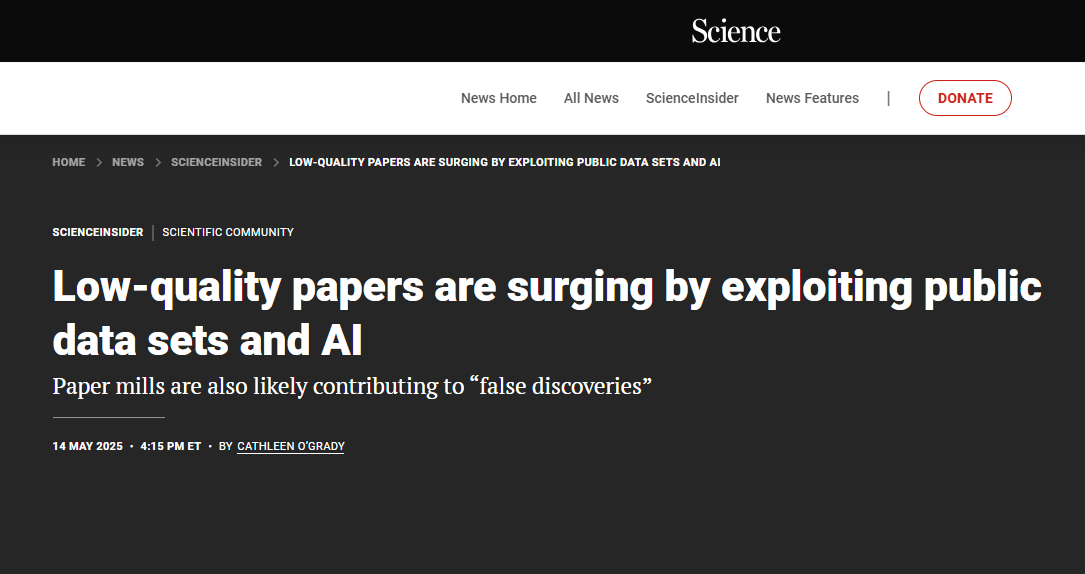 据Science 报道,Scientific Reports 副主编Matt Spick发现大量利用美国国家健康与营养调查(NHANES)数据的公式化论文大量涌入Scientific Reports、PLOS Biology等期刊中。这些低质论文的激增,可能是由“论文工厂”主导,并通过AI生成文本提供便利。