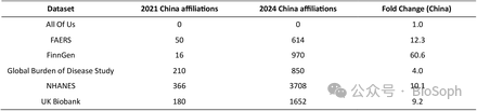 在检查这六个数据源论文的地理来源变化时,研究发现来自中国的论文从2021年占PubMed数据库索引论文的19%猛增至2024年的65%,为所有国家/地区中增长最多的。在这六个数据集中,FinnGen数据源的中国论文增长最为显著,截至2024年,89%相关论文的主要作者来自中国。