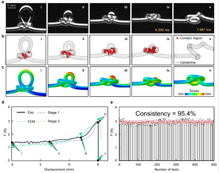 团队通过高速摄像机和Micro-CT,捕捉到活结细微的滑动轨迹。随后通过力学建模、有限元仿真等手段发现了活结蕴藏的有序规律——解开活结的力,与编紧活结时拉紧结点的力(预紧力)、结环数量、直径、摩擦系数、模量相关。