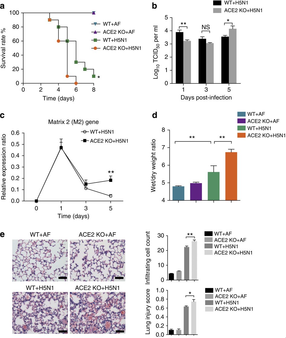在第二项研究中,姜成玉及其同事发现,与健康人相比,感染H5N1禽流感病毒的人中“血管紧张素II”的水平也增加了。此外,他们还报告说,用H5N1病毒感染小鼠后,其“血管紧张素II”水平升高,而ACE2(血管紧张素转化酶2)的表达降低。 ACE2是一种可以使“血管紧张素II”失活的蛋白质。*后,研究小组发现,人ACE2的使用改善了感染H5N1的小鼠的疾病症状并降低了“血管紧张素II”的水平。综上所述,这两篇论文具有重要的临床意义,并为禽流感患者的疾病致病机理提供了新的认识。然而,需要进一步的研究以确定“血管紧张素II”是否是有用的生物标记并评估ACE2的潜在功效。