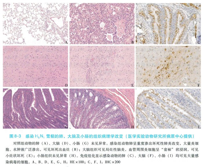 3.雪貂感染H5N1模型指标和结果 雪貂在实验前1周测正常体温和体重,确定正常值,雪貂在H5N1病毒接种的第2天时体温升高,体温升高0.5~2℃,体温升高持续3d左右,临床有死亡现象。雪貂感染后出现流涕,打喷嚏,有呼吸困难,摄食减少,精神萎靡,活动度下降,对外界刺激无反应等临床表现。病毒感染雪貂后第1天到第5天,用RT-PCR方法可从鼻甲骨活检物中检测到病毒载量。从雪貂的鼻甲骨标本、肺组织标本中,经MD- CK细胞培养,接种细胞产生典型细胞病变(CPE),提示病毒感染了雪貂并有病毒的复制和排毒,鼻甲骨标本分离阳性的高峰期在2~6d。可在脑、心、肝、脾、肠、肾、淋巴结组织中分离到活病毒,此结果证明H5N1病毒可以在呼吸道以外的组织器官中复制、繁殖。用HA方法可证实MDCK细胞有H5N1抗原存在。在H5N1病毒接种前和接种后第5天安乐时,经静脉采血1ml分离血清,检测血清中H5N1病毒特异性抗体。感染雪貂在5天安乐死时,均为阴性。解剖大体观察可发现肺组织表面局部有轻度实变现象,镜检可见肺泡腔内的明显炎性渗出物,伴有淋巴细胞、吞噬细胞浸润。肺间隔广泛增宽伴大量单核细胞为主的炎细胞浸润,肺泡受压变形变小,并有局限性肺泡间隔增宽后相互融合,部分区域有大片状肺泡间隔增宽后相互融合。肺泡间隔内有淋巴细胞、浆细胞、吞噬细胞,病变范围广泛,呈中重度间质性肺炎,见图8-3。
