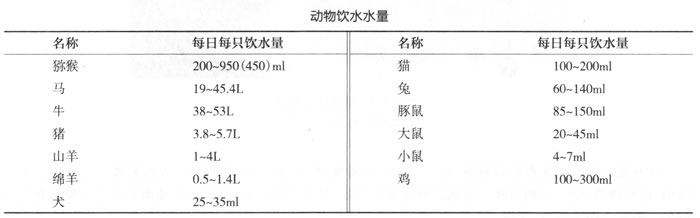 在动物实验室饲养的动物分大、中、小型动物。大型动物如:犬、猪、猴、羊、牛、马等;中型动物如:兔子、鸡等;小型动物如:小鼠、大鼠、豚鼠等。动物饮水的方法很多,如用水槽、龙头、水碗、瓶、啜头等,动物饮水水量详见表1-1-4。