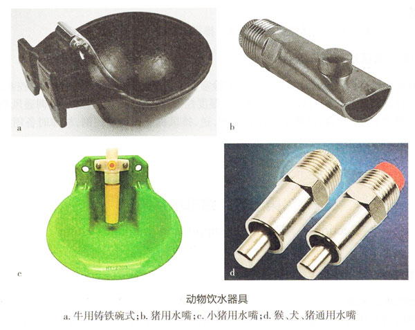 大型动物要消耗大量饮水,常使用可以自动分发的、能自清洗无弯管的饮水器,见图1-1-6。水碗及其他各种送到动物围栏内的设备,都要能够承受动物的破坏。水碗可以安装在水管、墙壁或地板上,设计时应考虑啜头或龙头的更换,软管的高度和长度也应该可以调节,以满足不同种动物的需要。同时要注意在围栏中水碗的朝向,要考虑围栏开关的方向、动物的朝向、动物排泄和气流的方向。大动物直饮水,一般由自来水经紫外线消毒后供给。