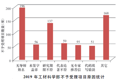 2019年工材学部不予受理项目总计722项,其中面上项目343项,青年科学基金118项,地区科学基金83项,重点项目14项,其164项。不予受理的主要原因见下图: