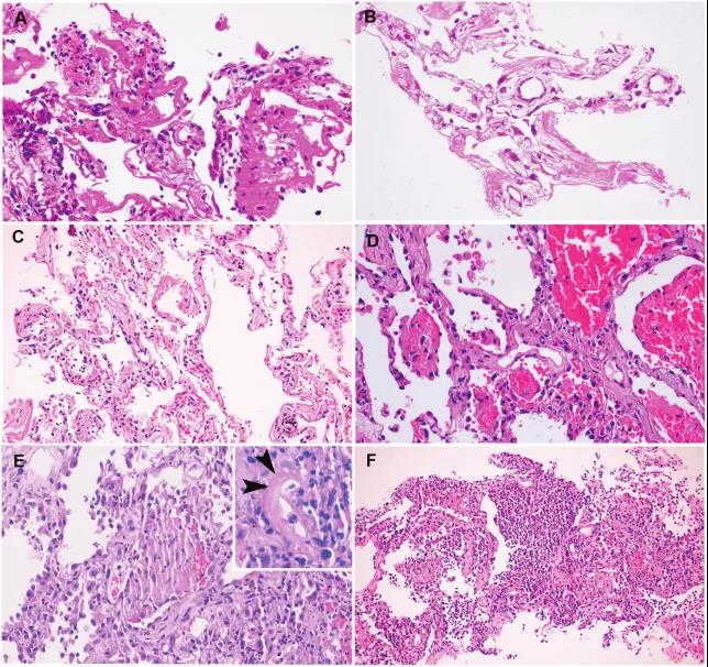 (E) 肺泡内成纤维细胞混合纤维蛋白和炎症性细胞浸润的器官化,背景弥漫型肺细胞增生(插图:纤维蛋白样血管坏死,箭头所指;