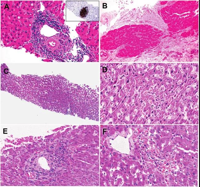 (F) 病例4出现局灶性肝小叶中央坏死。