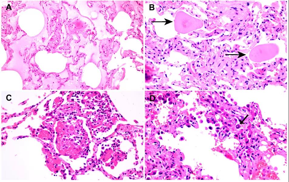 (B)成纤维细胞增生、II型肺细胞增生导致肺泡壁和隔膜弥漫性扩张,与早期弥漫性肺泡损伤(DAD)模式一致;