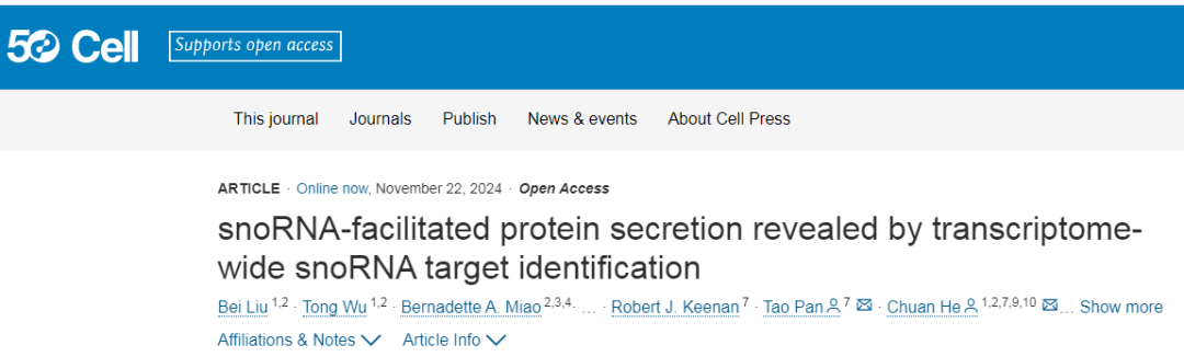 11月22日,芝加哥大学的何川、潘涛教授团队在顶刊《Cell》发表了一篇题为“snoRNA-facilitated protein secretion revealed by transcriptome-wide snoRNA target identification”的研究论文。