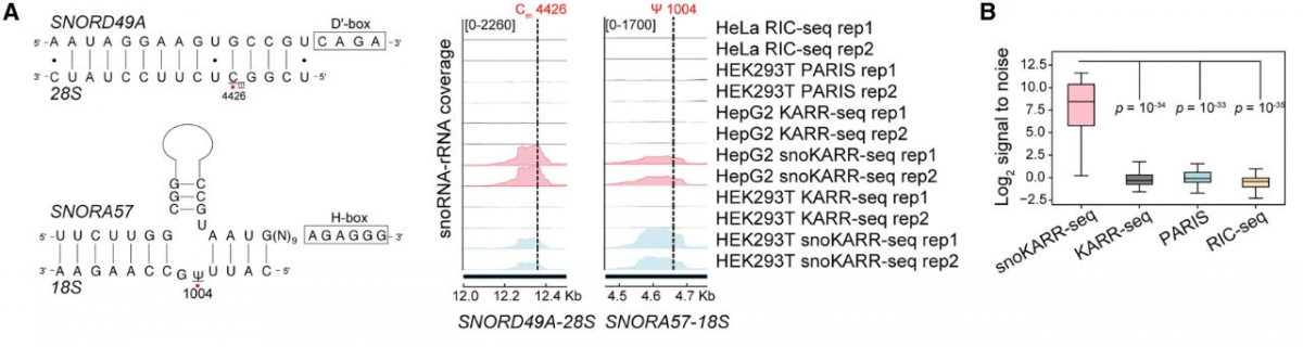 研究团队利用该方法在不同的细胞系(HepG 2,MDA-MB-231,A549,PC 3和HEK 293 T)中鉴定了rRNA以外的数千个snoRNA靶标,发现其相互作用位点多发生在非传统RNA修饰位点,说明snoRNA可能存在其他的非经典调控作用。