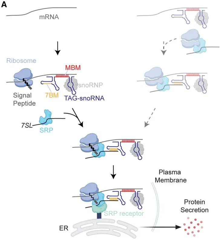 SRP是细胞内负责识别新生肽链中的信号肽并将其引导至内质网(ER)进行分泌或膜整合的经典蛋白质转运分子。SNORA73在这一过程中充当“分子胶水”,通过双重RNA-RNA相互作用将SRP复合物与靶mRNA连接,显著提升靶标mRNA与SRP的结合效率,促进翻译复合物的内质网转运,从而提高分泌性蛋白的转运和释放。