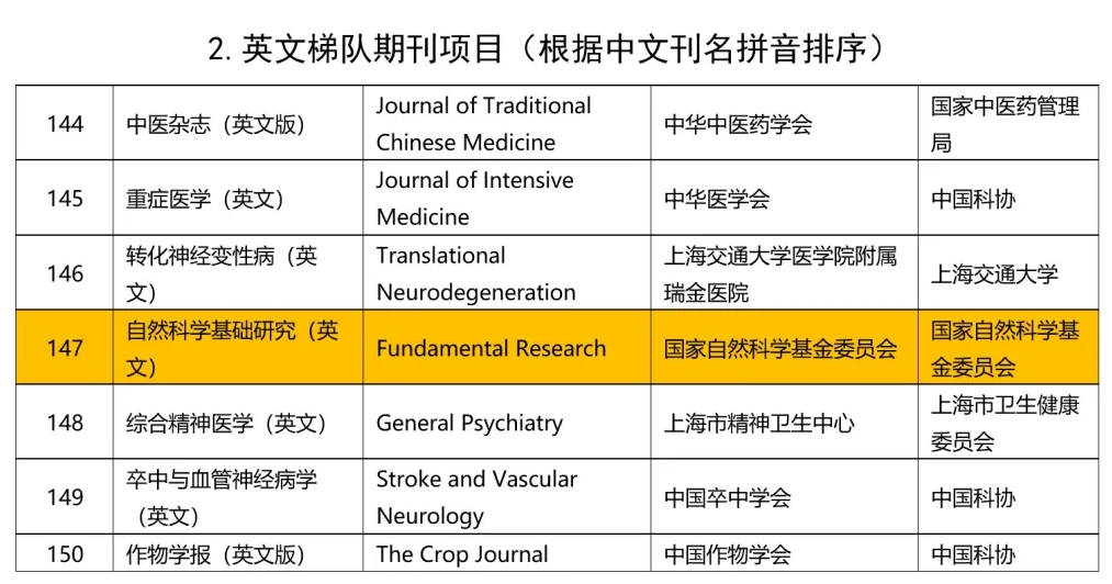根据中国科协、教育部、科技部、财政部、国家新闻出版署、中国科学院、中国工程院《关于组织实施中国科技期刊卓越行动计划二期项目的通知》(科协发创字〔2024〕41号)、《中国科技期刊卓越行动计划二期项目评审方案》及细则有关规定,经公开申报、资格审查、陈述答辩、专家委员会复核、结果公示,确定中国科技期刊卓越行动计划二期入选项目共计463项。其中,由国家自然科学基金委员会主管、主办的英文期刊Fundamental Research入选卓越二期英文梯队期刊项目,将获得连续5年、每年不超过50万元的资助。这是在期刊主编团队指导下,各位编委、审稿人及广大读者、作者的大力支持下,大家共同努力取得的阶段性成果。感谢科技界、出版界的认可,感谢各位专家的鼎立支持!!