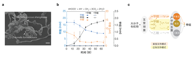 a.甲醇生成细菌与甲基型产甲烷古菌共培养物显微照片。标尺= 1 µm;b.细菌与古菌共培养时甲醇生成细菌转化甲酸生成甲醇并被甲醇利用古菌转化为甲烷;c.细菌古菌互作产甲烷四种模式示意图。