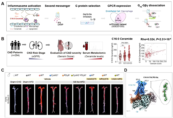 研究团队发现,半胱氨酸白三烯受体2(cysteinyl leukotriene receptor 2,CYSLTR2)和嘧啶能受体P2Y6(pyrimidinergic receptor P2Y6, P2RY6)是神经酰胺的内源性受体。研究团队成功解析了“神经酰胺C16:0-CYSLTR2-Gq”复合物的三维结构,揭示了一个特定的结合口袋,决定了CYSLTR2对神经酰胺亚型的识别。神经酰胺与这些受体结合后,激活下游Gq蛋白介导的炎症小体通路,在动脉粥样硬化的发病机制中发挥关键作用。进一步动物实验证实,通过基因敲除或特异性拮抗剂阻断CYSLTR2或P2RY6两种神经酰胺受体,可在不影响血脂水平的情况下,使斑块负荷减少,双受体联合阻断效果更加显著。此外,临床队列研究显示,慢性肾病合并冠心病患者血浆神经酰胺水平与冠状动脉病变程度呈显著正相关,提示神经酰胺可能成为动脉粥样硬化性心血管疾病的新型生物标志物(图)。