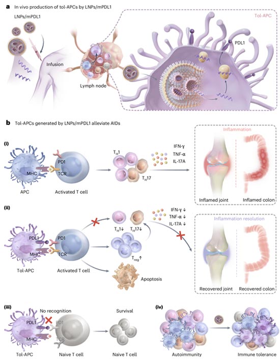 图 低免疫原性递送PDL1 mRNA在体生成耐受性抗原提呈细胞(tol-APCs)技术示意图。(a)低免疫原性脂质纳米颗粒(LNPs)递送PDL1 mRNA在体生成tol-APCs的过程;(b)生成的tol-APCs通过PDL1/PD1通路选择性抑制活化T细胞,有效缓解自身免疫病症状