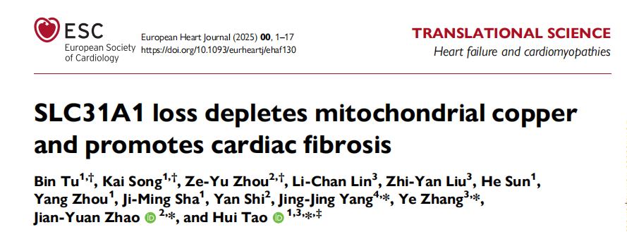 今年3月,安徽医科大学第二附属医院陶辉教授团队联合上海交通大学医学院附属新华医院赵健元教授、张野教授团队,在《European Heart Journal》发表了题为“SLC31A1 loss depletes mitochondrial copper and promotes cardiac fibrosis”的研究,首次系统揭示了#线粒体铜耗竭通过糖酵解重编程 及 #m6A 表观遗传通路驱动心脏纤维化的新机制,为 CF 的防治提供了突破性理论依据。