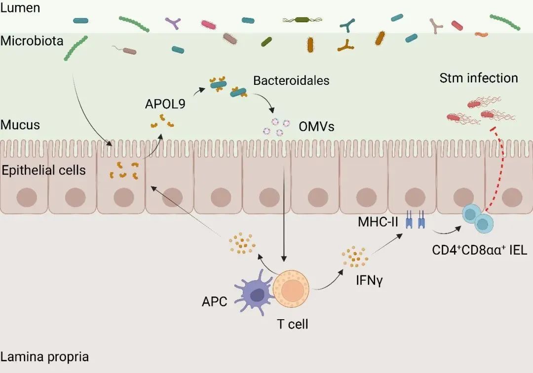 研究人员构建的APOL9a/b敲除小鼠模型显示,缺乏该蛋白的小鼠肠上皮细胞中MHC-II分子表达显著减少,肠道免疫屏障功能削弱。当面对沙门氏菌等肠道病原体时,这些小鼠表现出更高的死亡率、更严重的肠道炎症以及细菌向全身扩散的倾向。