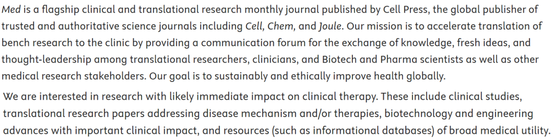 该期刊Med致力于成为临床医生、转化研究人员、生物技术和制药科学家交流知识、新思想和领导力的核心平台,以期发表能够对临床治疗产生立竿见影影响的研究,推动医学知识边界,最终改善患者诊疗。