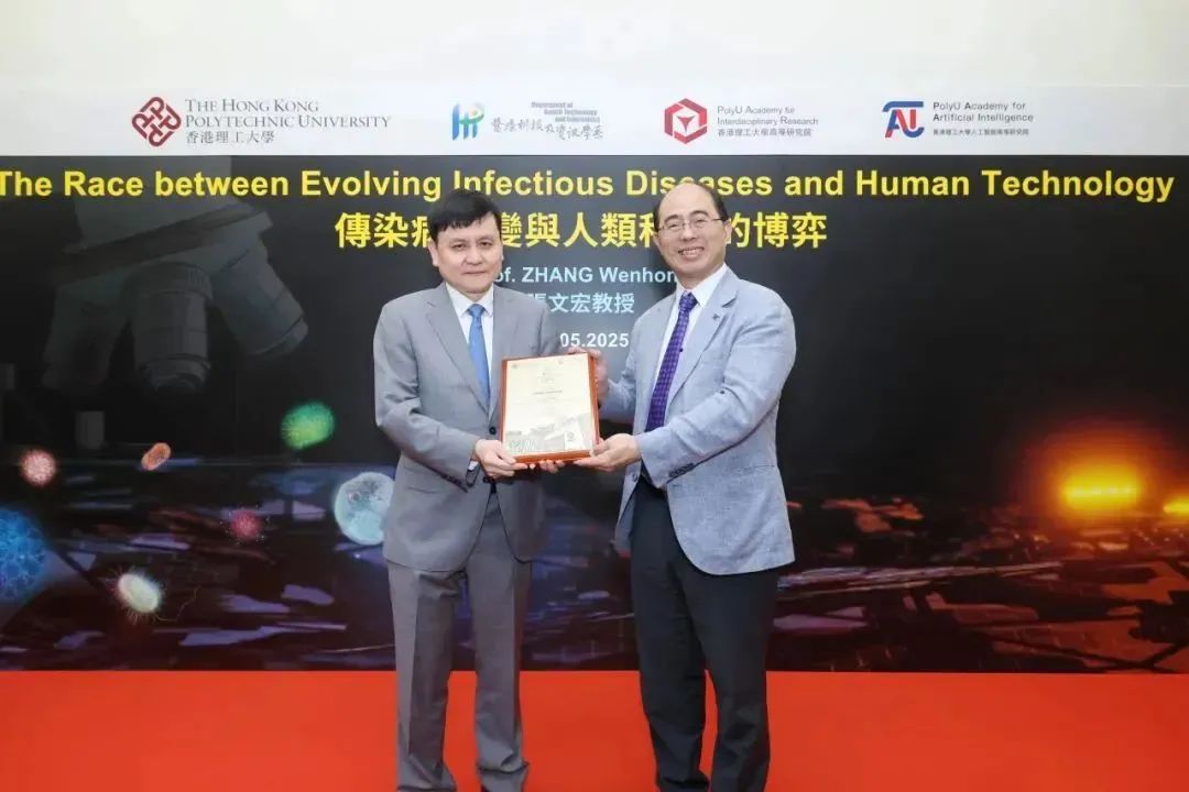 演讲结束后,香港理工大学特别举行了聘任仪式,由常务及学务副校长黄永德教授向张文宏教授颁发聘书,正式聘请其担任香港理工大学医疗科技及资讯学系荣誉教授。