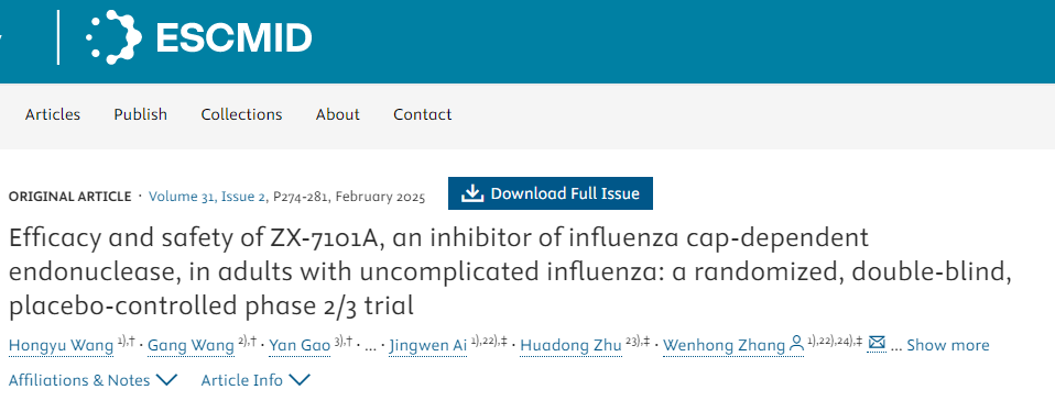 2 月,张文宏团队联合北京协和医院急诊科主任朱华栋教授、华山医院感染科艾静文教授在Clinical Microbiology and Infection(IF=10.9)发表了题为“Efficacy and safety of ZX-7101A, an inhibitor of influenza cap dependent endonuclease, in adults with uncomplicated influenza: a randomized, double-blind, placebo-controlled phase 2/3 trial”的论文,评估流感病毒帽依赖性内切酶抑制剂 ZX-7101A 在无并发症流感成人患者中的疗效和安全性,并探索治疗中出现的耐药性。
