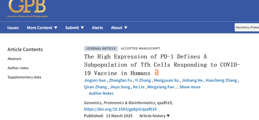 3月13日,张文宏团队再与艾静文团队合作,作为共同通讯作者在Genomics Proteomics Bioinformatics(IF=11.5)杂志发表了题“The High Expression of PD-1 Defines A Subpopulation of Tfh Cells Responding to COVID-19 Vaccine in Humans”的研究论文,针对 COVID-19 灭活疫苗联合 RBD 亚单位加强免疫后 CD4+ T 细胞的应答机制展开探究