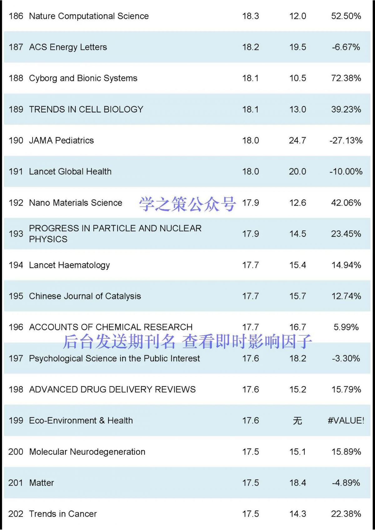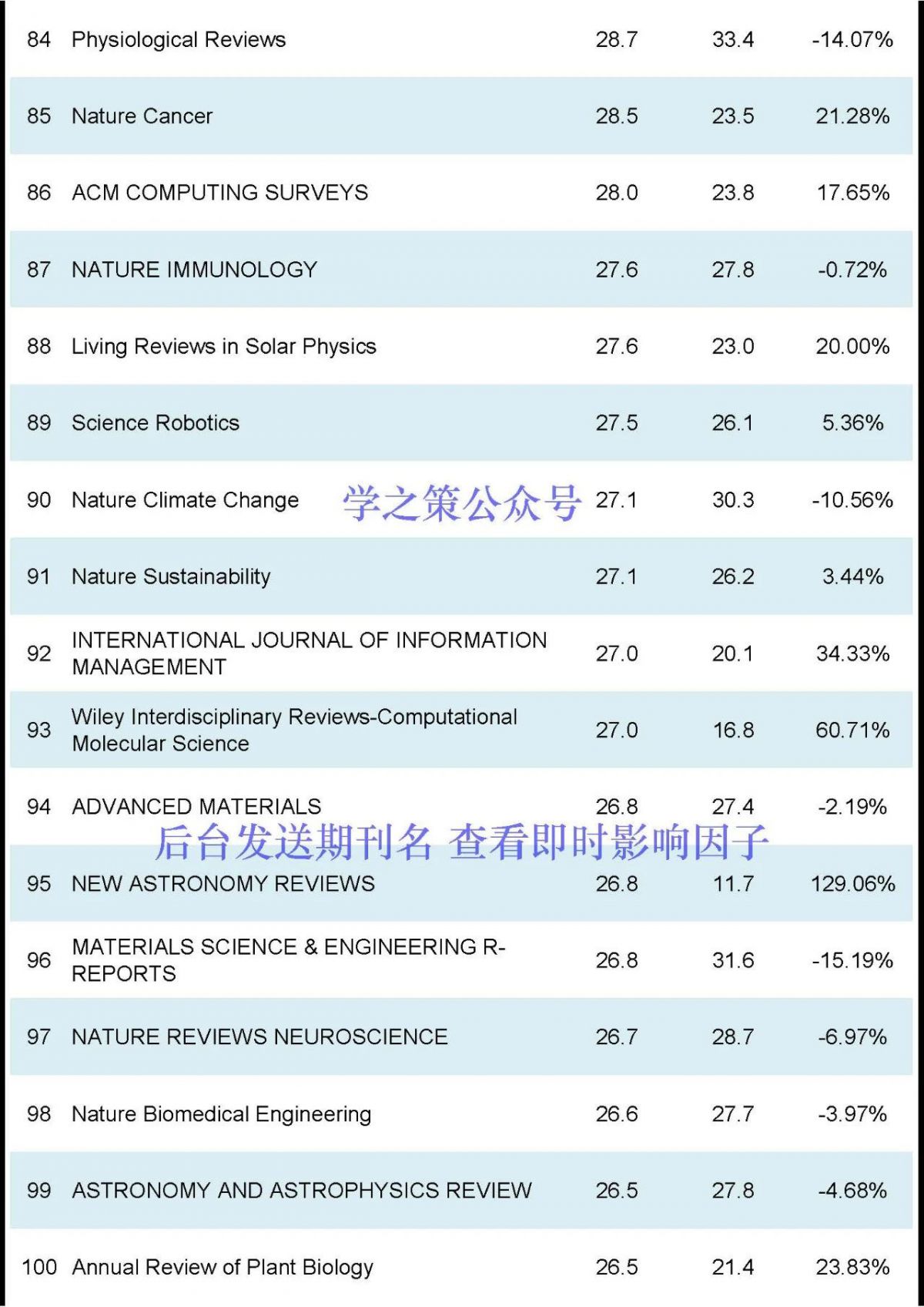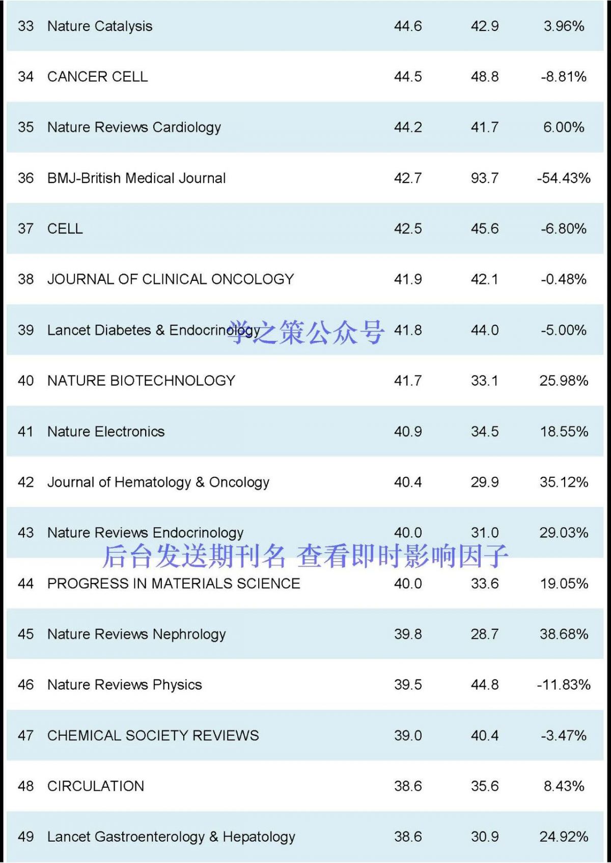CA-A CANCER JOURNAL FOR CLINICIANS的IF腰斩,但凭借232.4的高分仍然高居榜首。其次是两本Nature综述子刊。