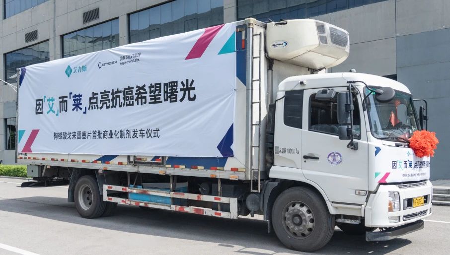 6月16日,上海艾力斯医药科技股份有限公司与凯莱英医药集团联合举行艾瑞凯®(枸橼酸戈来雷塞片)首批商业化制剂发车仪式,上午10点18分,满载着艾瑞凯®的药品运输车辆从凯莱英医药天津工厂顺利启程,正式启动全国商业化供货。