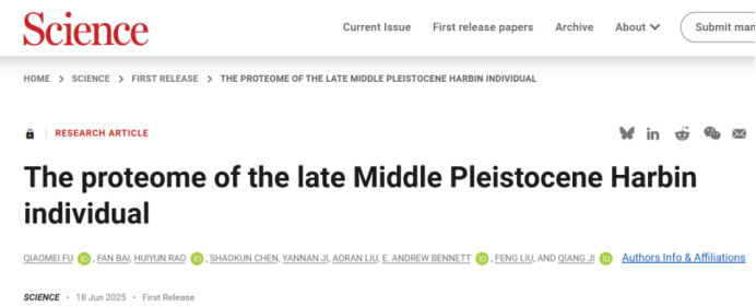 这两项成果分别名为The proteome of the late Middle Pleistocene Harbin individual。