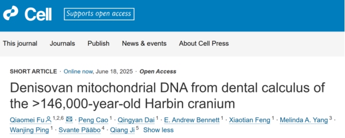 以及Denisovan Mitochondrial DNA from Dental Calculus of the > 146,000-year-old Harbin Cranium,研究成果对距今至少 14.6 万年的哈尔滨古人类近完整颅骨开展了分子古生物学研究。
