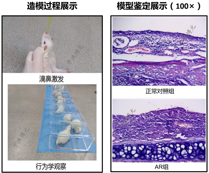 实验方法:1.模型鼠经腹腔注射卵清蛋白(OVA)/氢氧化铝凝胶混合制剂7次后,观察1周,从第21天起雾化吸入OVA ,鼻腔滴入OVA鼻内激发,连续7次。2.通过鼻粘膜病理HE染色分析判断模型。