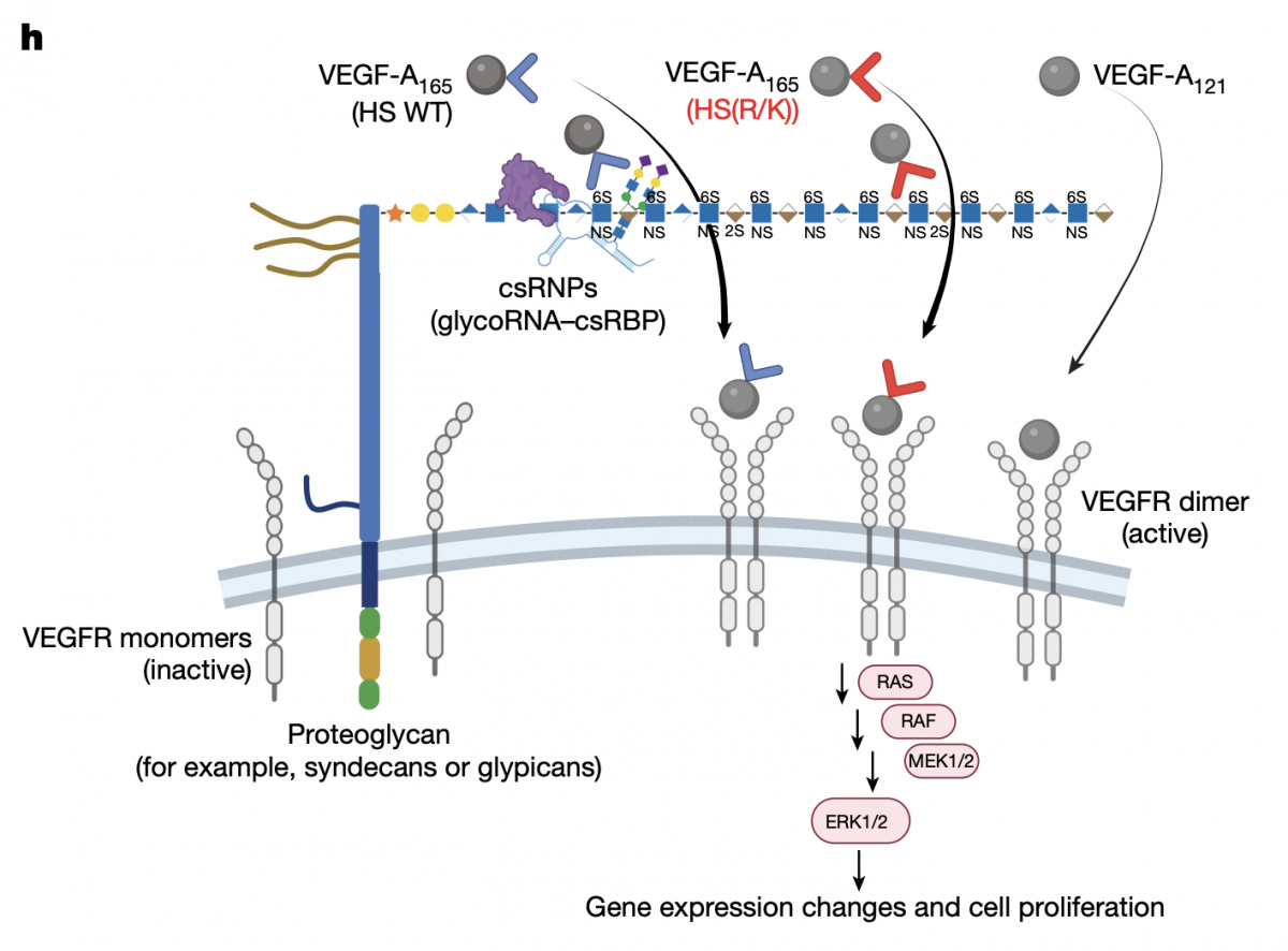 该研究揭示了 glycoRNA 在活细胞膜表面的调控——glycoRNA 与硫酸乙酰肝素(HS)形成的复合物调控 VEGF-A 信号转导,从而揭示了 glycoRNA 在血管发育中的新作用。